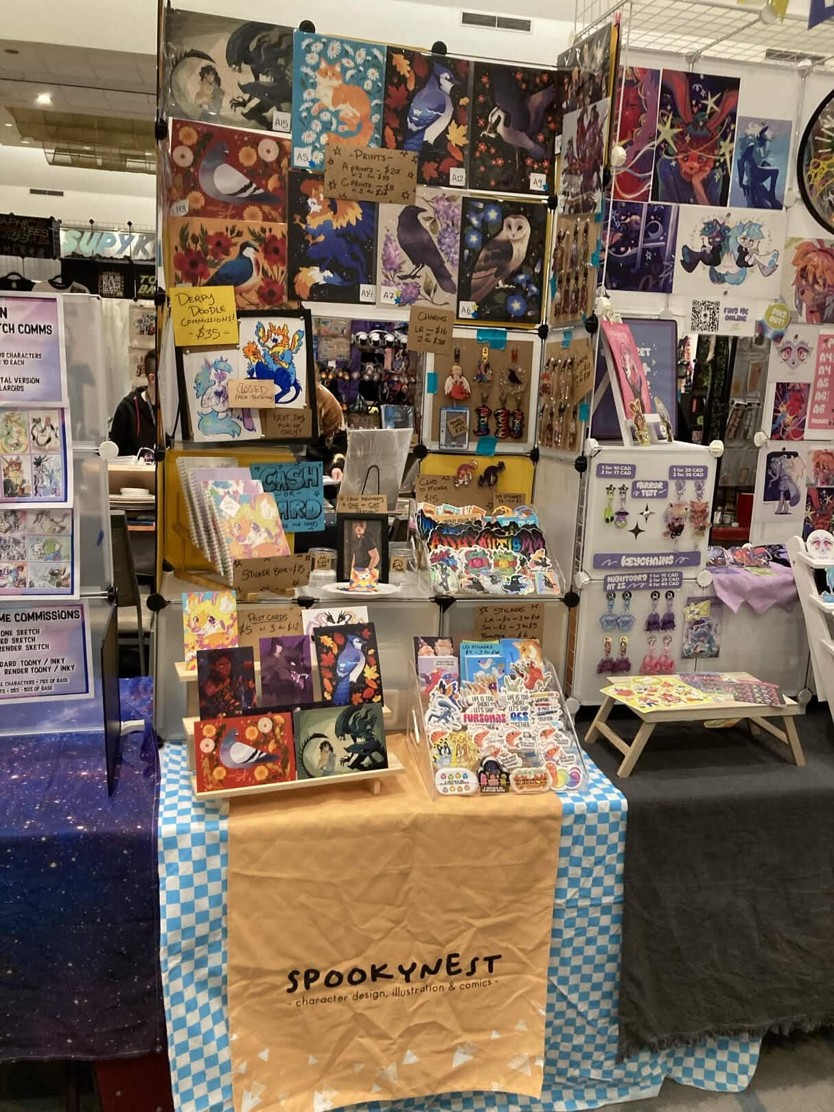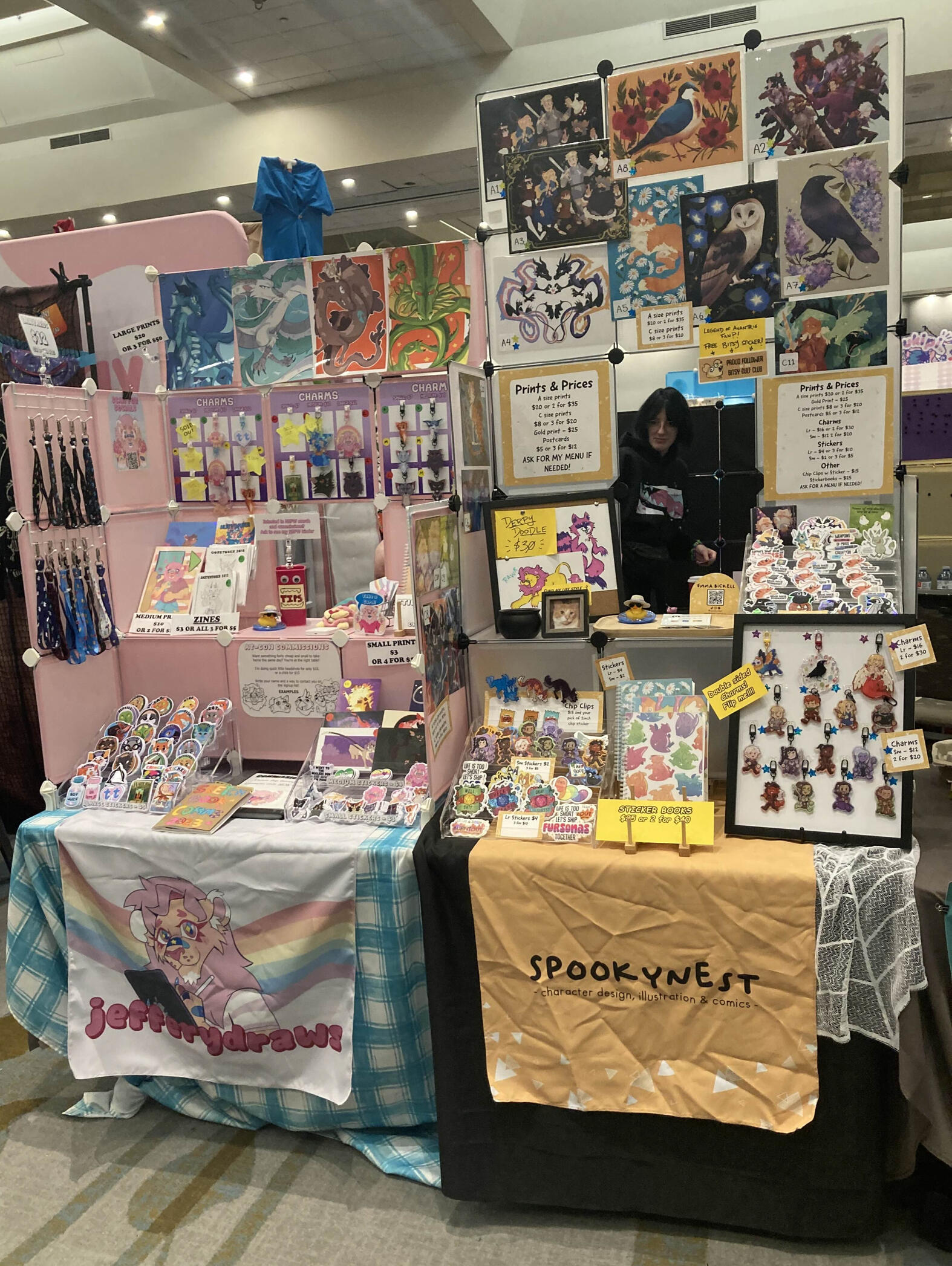 Welcome to my events page! I have been tabling at event and conventions since 2016 giving my 10 years of experience under my belt of running my own small business on the side. Here you can find photos of my table displays, product and future event updates.A large sum of my products are paper base; stickers & prints. I also sell acrylic charms, sticker books, commissions.